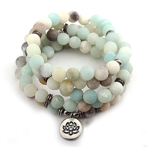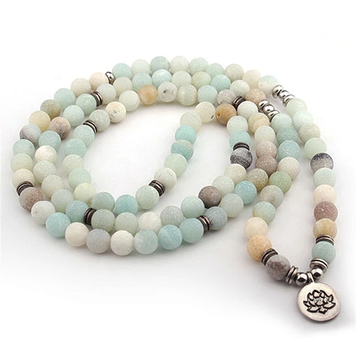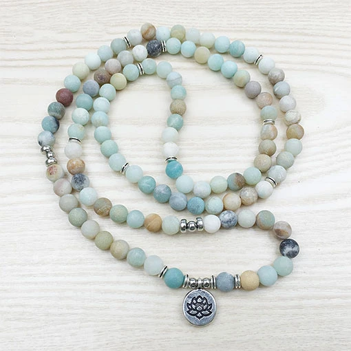 Laissez-vous séduire par le Collier Mala Yoga en pierres fines d’Amazonite. Ce bijou vous aidera à vivre l’instant présent et à relativiser les choses. Idéal pour la méditation et le yoga