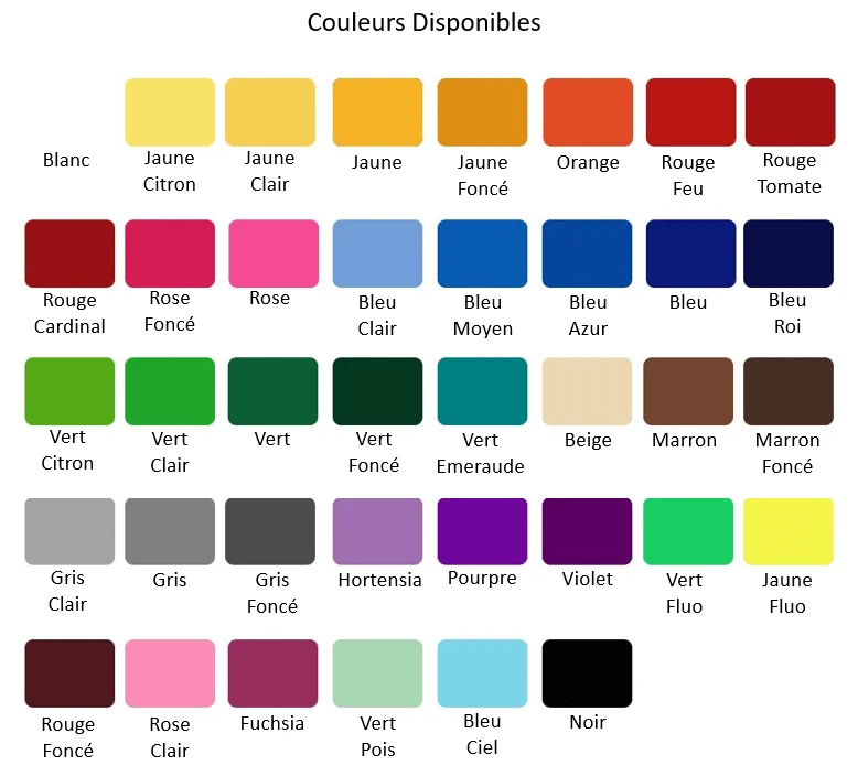 | Couleur | beige, blanc, bleu, bleu-azur, bleu-ciel, bleu-clair, bleu-moyen, bleu-roi, fuchsia, gris, gris-clair, gris-fonce, hortensia, jaune, jaune-citron, jaune-clair, jaune-fluo, jaune-fonce, marron, marron-fonce, noir, orange, pourpre, rose, rose-clair, rose-fonce, rouge-cardinal, rouge-feu, rouge-fonce, rouge-tomate, vert, vert-citron, vert-clair, vert-emeraude, vert-fluo, vert-fonce, vert-pois, violet |
